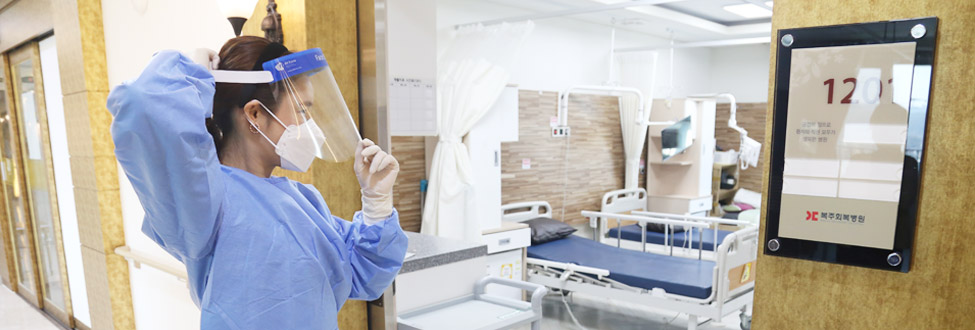 감염병에 걸렸다고 퇴원을 권유하는 병원과 의사의 잘못이 아닙니다. 감염병을 관리하는 의료체계 때문입니다. 격리가 해제될때까지 재활치료를 포기하거나 가정에서 치료를 이어가는 경우가 많습니다. 활발한 신체활동이 면역력을 높여주기 때문에 저희 복주회복병원은 별도의 전담치료실을 운영하여 집중적인 재활치료가 필요한 골든타임(발병 후 6개월)을 지켜드리고자 노력하고 있습니다.