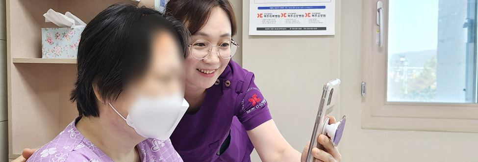 갑작스런 질환으로 약해져 버린 신체, 감염증으로 함께 지내지 못하는 현실 입니다. 익숙하지 않은 환경 앞에 한자와 가족들은 서로에게 미안하고 불안한 마음이 들게 됩니다. 복주회복병원은 환자와 가족들이 조금이라도 빨리 정서적 안정을 취할 수 있도록 병동에 비치된 휴대폰을 통해 영상통화와 병원 생활을 공유하여 조금 더 편안한 마음으로 병원 생활을 할 수 있도록 노력하고 있습니다.